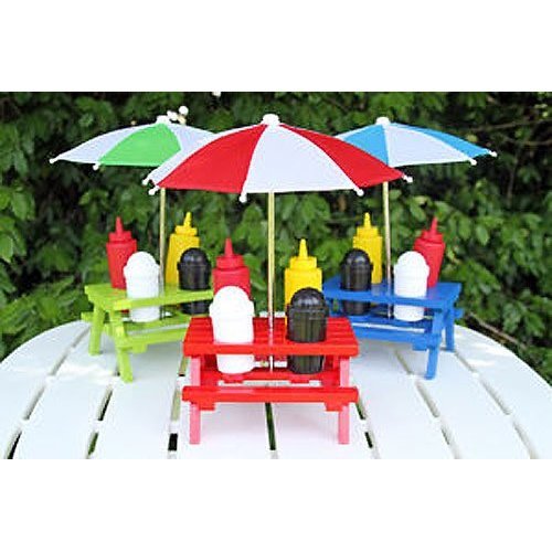 -. Feature : Salt & Pepper Shakers (3 oz.) / Ketchup & mustard containers (4.4 oz.) / Blue umbrella & wooden table. / NOTE: You will receive random color: Blue, Red or Green