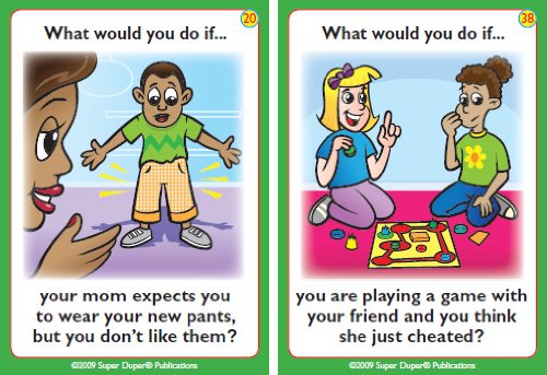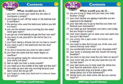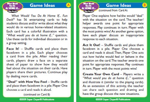 Help your children make good choices in and around the home with Super Duper's What Would You Do At Home If... Fun Deck. Children learn how to solve problems, understand cause/effect relationships, and practice good social skills. 56 total cards with game ideas. Metal tin. 2 1/2" x 3 1/2".