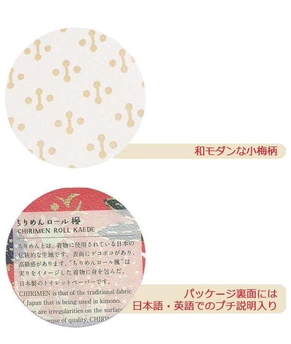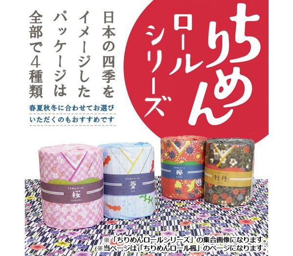 「ちりめんロール楓」は秋の実りをイメージした着物に身を包んだ、再生紙100%の日本製トイレットペーパーです。飾っても使用しても、彩り鮮やかに華やかに「和」を感じていただけます。ご自宅用としてはもちろんのこと、個包装なのでイベントの景品やギフトとしてもぴったりです♪パッケージに英語の説明が入っているので、外国人の方へのプレゼントとしてもおすすめです。 |