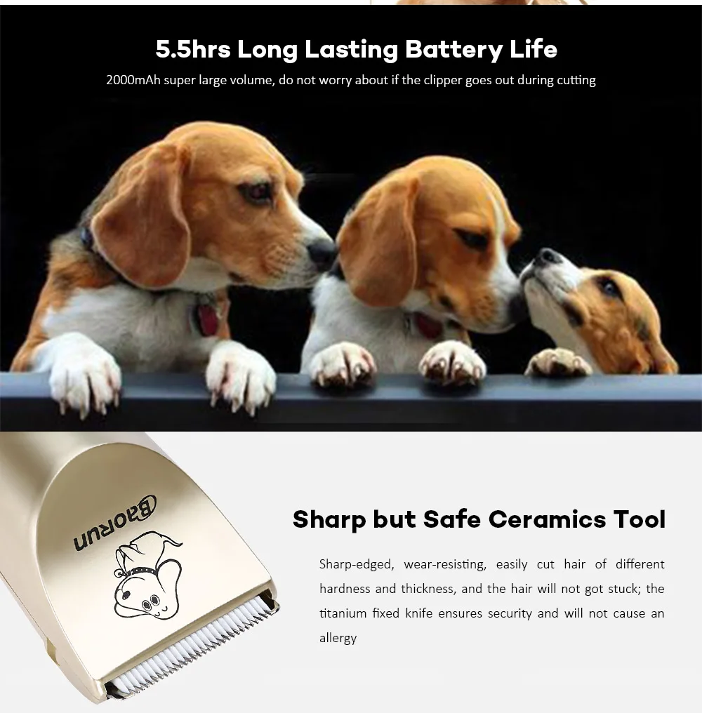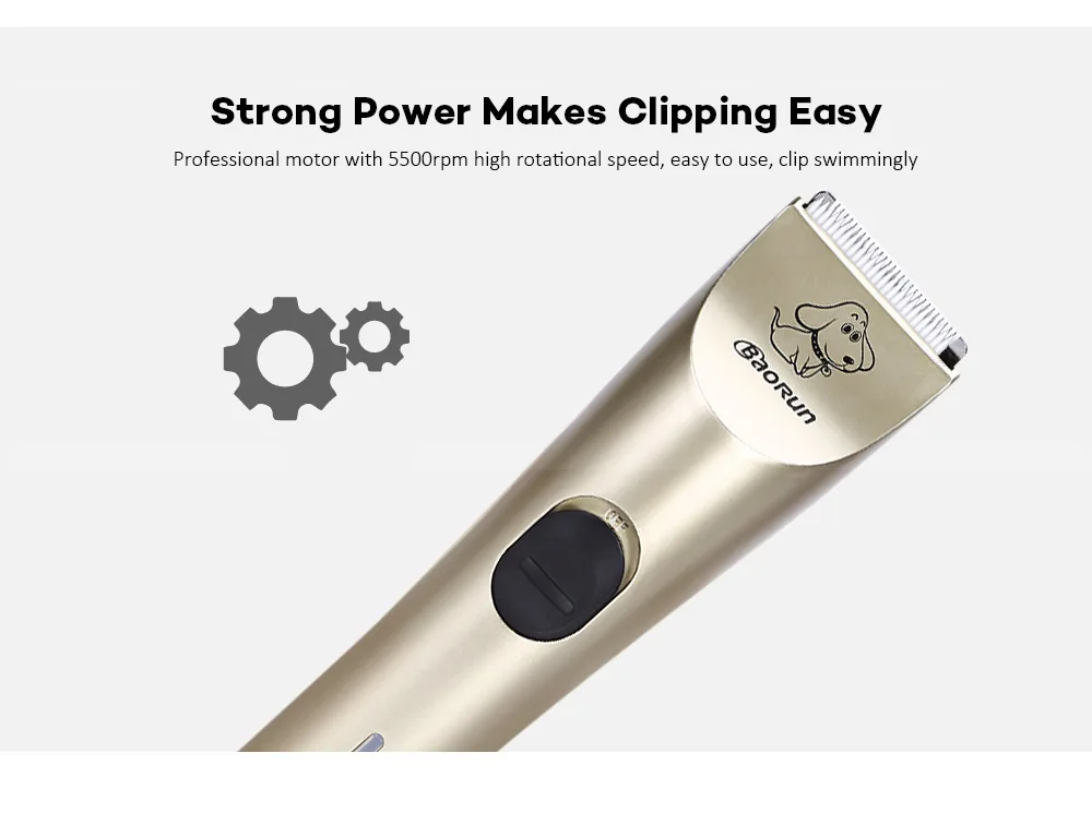| Package Contents | 1 x BaoRun Pet Grooming Clipper, 1 x Cleaning Brush, 4 x Limited Comb ( 3mm, 6mm, 9mm, 12mm ), 1 x Power Adapter ( 150cm ) |