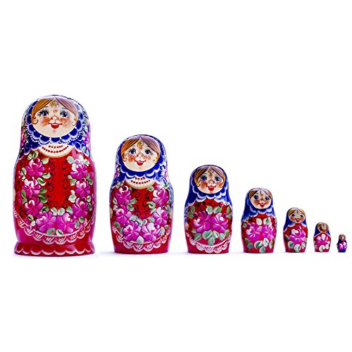 -. Title : 8.5" Set of 7 Blue Scarf Red Dress Matryoshka Russian Nesting Dolls