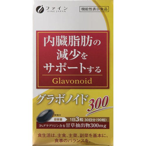 [ファイン グラボノイド 300 90粒入]は、内臓脂肪の減少をサポートする機能性表示食品です。1日摂取目安量あたり3%グラブリジン含有甘草抽出物が300mg含まれております。内臓脂肪が気になる方や肥満気味の方に。