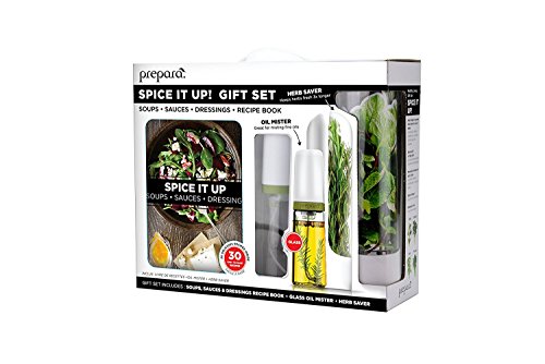 -. Feature : This gift set includes everything you need to make delicious soups, sauces and dressings everyone will enjoy / The Prepare Herb Savor helps keep your herbs fresh for longer. Allowing you to enjoy more flavorful recipes / The Glass Oil Mister gives you control over your oil usage. It lets you lightly spray, not slather, your salads. Perfect for grilling, roasting, sautéing and coating pans / Paired with Chef Billy Strynkowski's Soups, Sauces and Dressings recipe book which includes 30 easy to make recipes, this complete set makes a perfect gift for anyone that wants to cook healthy and fresh / Set includes: 1 Herb Savor, 1 Glass Oil Mister and our Spice It Up! Cookbook which features 30 easy to make recipes. 100% BPA free and top rack dishwasher safe