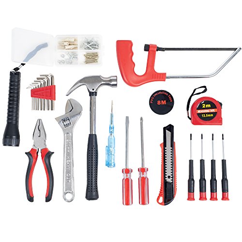 -. Feature : Includes: 9 oz. Hammer, 6.5" Bull Nose Pliers/Wire Cutter, 8" Adjustable Wrench, 5" 100-500V Voltage Tester / Screw, Nail, Dry Wall Anchor and Washer Set, 5.75" Flashlight (Requires 2 AA Batteries - included) / 9.5" Mini Hack Saw (Blade is 6"), 7" Phillips Head Screwdriver, 7" Flat Head Screwdriver, 2 - 5" Flat Head Precision Screwdrivers / 2 - 5" Phillips Head Precision Screwdrivers, 6" Box Cutter, 80 inch Measuring Tape, 8 Metric Hex Keys (1.5mm, 2mm, 2.5mm, 3mm, 4mm, 5mm, 5.5mm, 6mm) / Case Dimension: Length: 2.5 inches, Width: 12.75 inches, Height: 9.75 inches