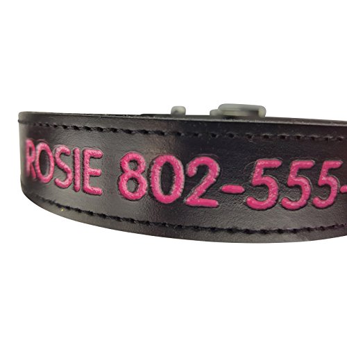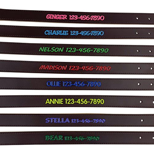 * Wandering dogs always find their way home with their name and phone number safely engraved and painted on their collar * Handpainted and engraved in our Vermont shop with durable, permanent, gloss color * Your choice of 8 durable text colors - Green, Light Green, Blue, Light Blue, Red, Pink, Yellow, Purple * 3 sizes fitmost small to large breeds with necks between 11.5 inches and 22 inches