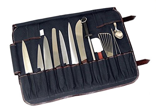Seventeen slots for knives and tools, three loops for pens or sharpies, three slots for business cards, and a utility pocket. The knife slots can hold a knife with an overall length of 17" Constructed with 100% cotton canvas and brass buckles. Dimensions when open are 28" x 20" and includes a shoulder strap.