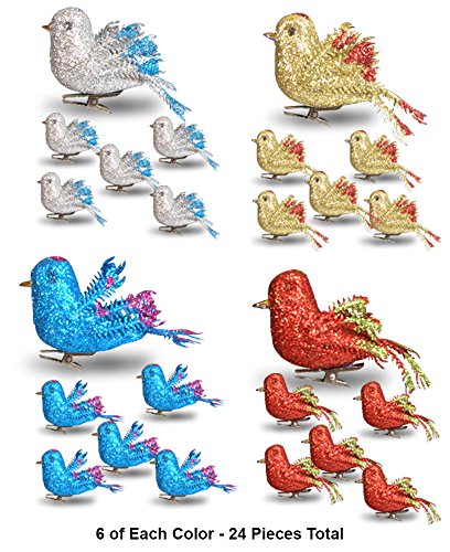 Christmas Bird Ornaments Decorations - Set of 24 Clip-On Birds - Package Includes 6 Red, 6 Blue, 6 Gold and 6 Silver Birds