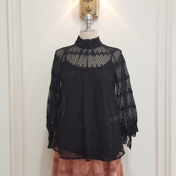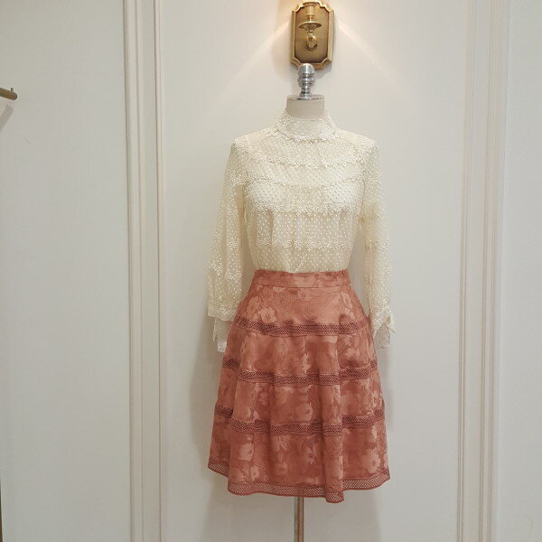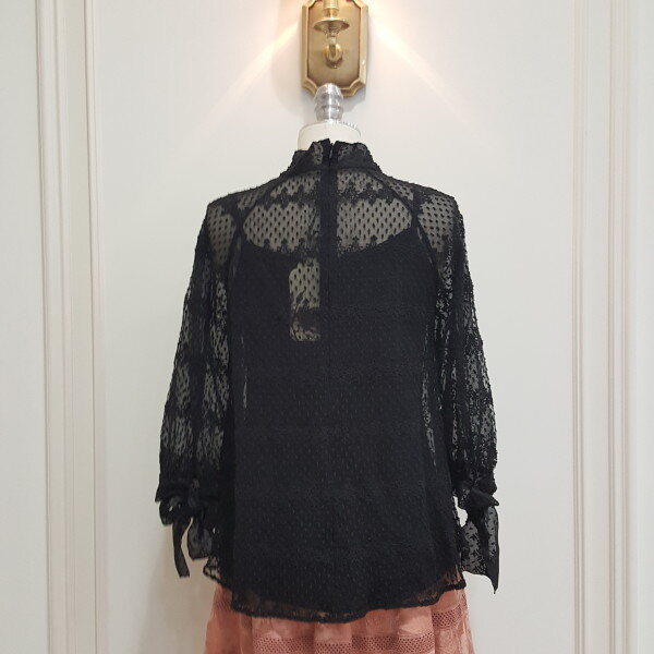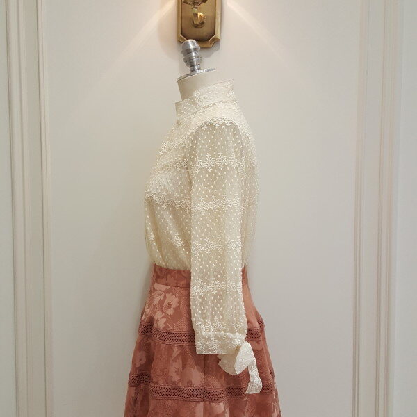 잔잔한 꽃자수가 은은하면서 고급스러운 블라우스. 소매에 리본 장식이 포인트.