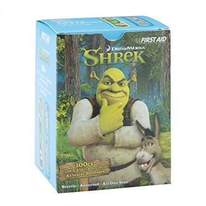 Product Description Go back to the swamp with fun bandages featuring Shrek and Donkey from the hit Dreamworks movies! Each box of First Aid Shrek and Donkey Bandages feature 100 bandages in two fun designs. Perfect for your offices, first-aid kits and home! 0