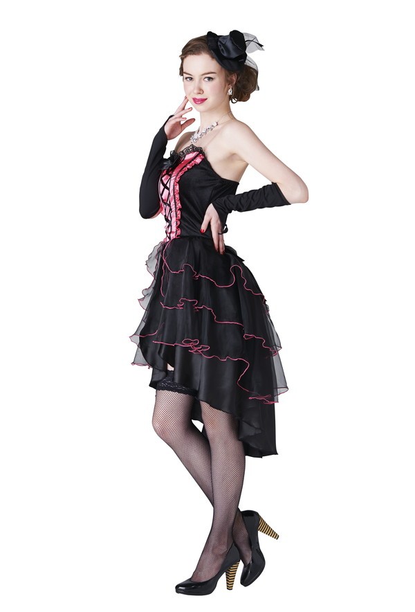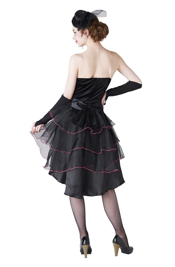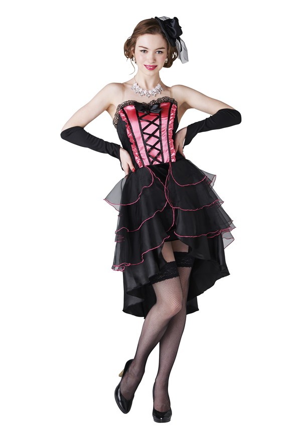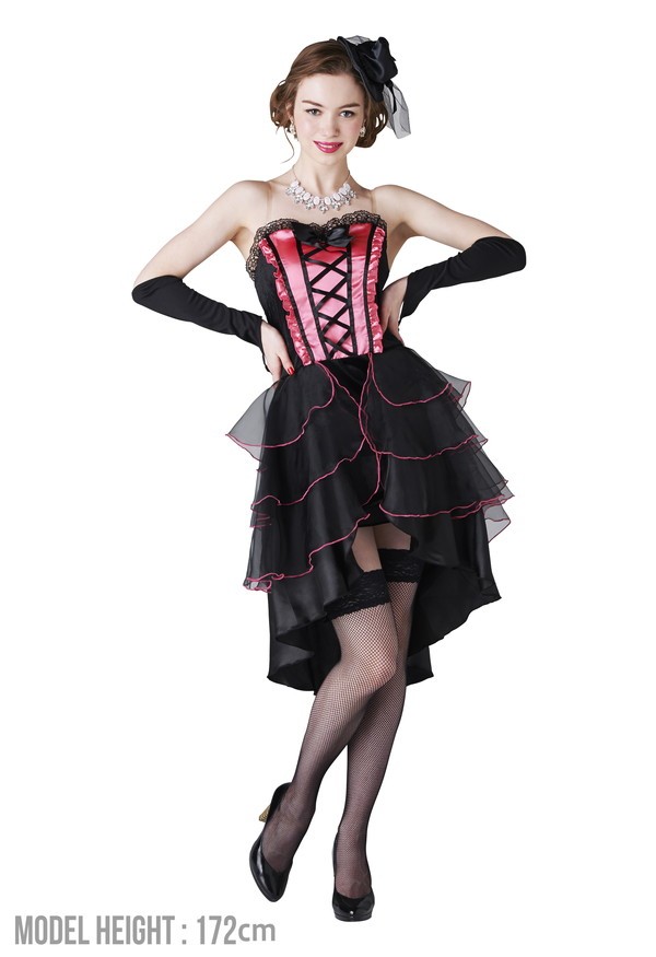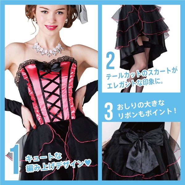ピンク×黒の組み合わせと、あみあげのデザインがセクシー&キュートなショーガール風コスチューム?テールカットのオーバースカートが、足を細く長く見せてくれます♪ミニハットやグローブなど、ショーガールになりきる為の必須アイテムも、しっかりセットに。腰には大きなリボンが付いて、後ろ姿まで可愛い!