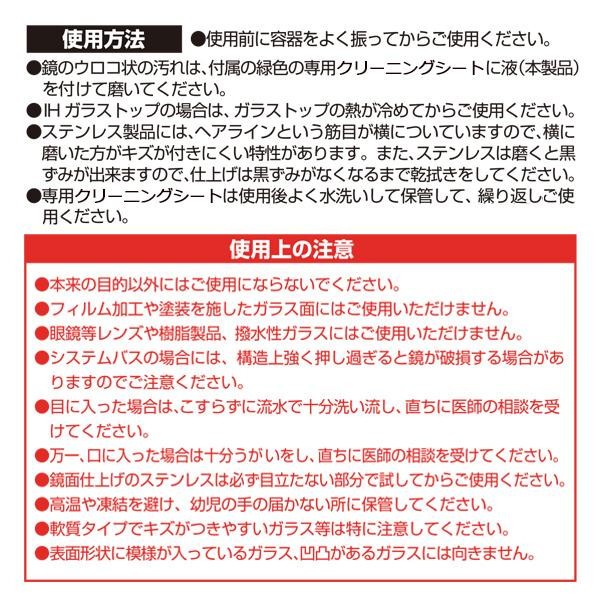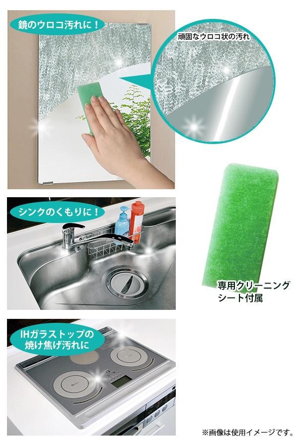 | 鏡に蓄積したしつこいウロコ状の汚れを落とします。流し台シンク等のステンレス製品に付着したウロコ状の汚れにも。 |