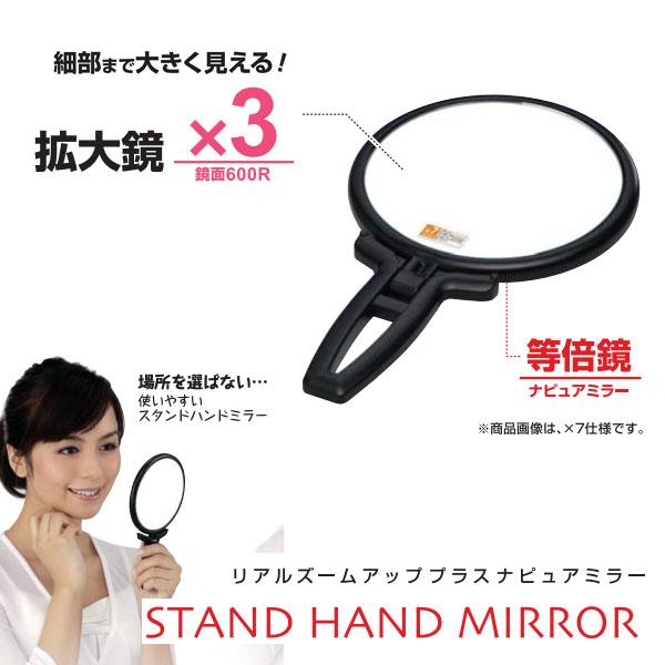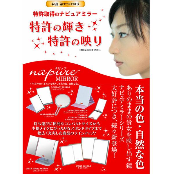 | 細部まで大きく見える拡大鏡はお肌のお手入れに最適!3倍ズームアップは、コンシーラー、アイメイクにオススメ!等倍鏡には、人気のナピュアミラーを採用。人から見た自分の本来の顔色を映すミラーです。ファンデーションを合わせたり、ポイントメイクをするのに最適!ハンド式で、折立もできるので、とっても便利! |