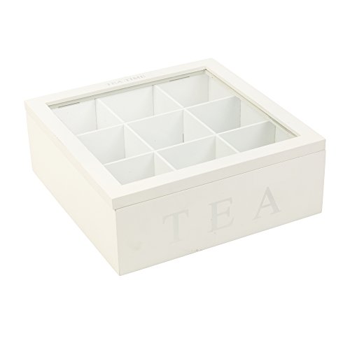 Studio : EGT Publisher : EGT Product Description Store your tea in this chic design Wooden Tea Box in white. It has 9 large compartments and a glass lid for viewing your selection. For those who don't drink tea, it can be used as a spice box or as a general food container. 0