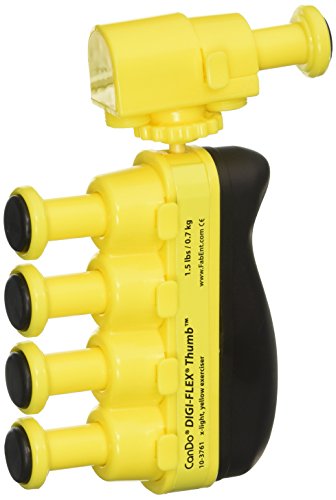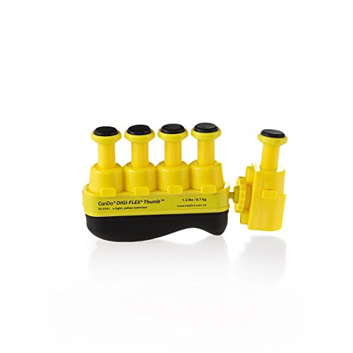 Studio : FEI Publisher : FEI Binding : Misc. Product Description The CanDo digi-flex thumb develops isolated finger and thumb strength, flexibility and coordination as it builds hand and forearm strength. The design allows for both left and right thumb usage. The adjustable thumb button can attach in 3 positions and rotates and reticulates. Each finger and thumb button can individually lock. Single Spring design, with springs hidden inside plastic sheath. Use each button independently to exercise fingers or compress the entire unit for complete hand and forearm strengthening. Progressive?color-coded resistance gives patient positive feedback. Yellow (x-light). 0