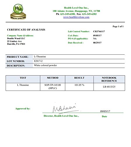 Studio : Double Wood Supplements Publisher : Double Wood Supplements Binding : Health and Beauty Product Description L-Theanine (L Theanine)( 5-N-Ethyl-Glutamine) is an amino acid that is not commonly obtained through diet. Once ingested, it reaches the brain and acts as a relaxing agent without sedative properties that are common among anti anxiety substances. It also helps promote relaxation and reduce stress when taken with other stimulants such as Caffeine. This synergistic effect promotes cognition and attention. Our L-Theanine is manufactured right here in New York before being tested by Health Level One for purity and potency verification. We also offer a 100% money back guarantee on all orders. No returns are required for orders of just one bottle. We don't want a single customer to leave unhappy! 0
