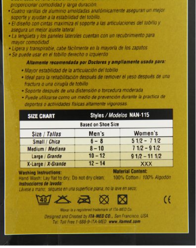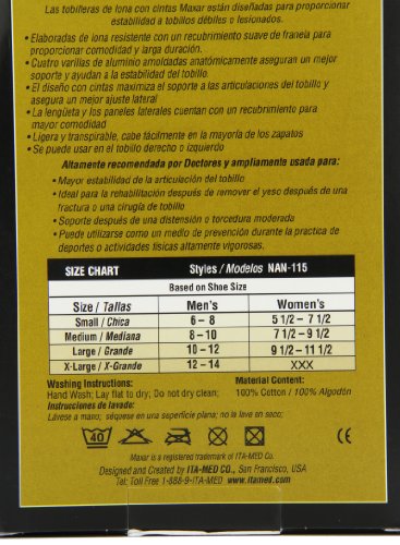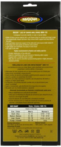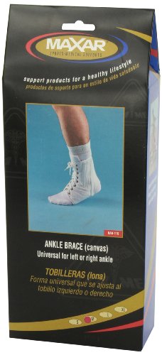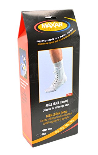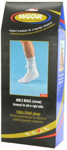-. Binding : Health and Beauty -. Brand : Maxar -. Color : White -. Feature : Fits right or left ankle / Light-weight and breathable, fits easily in most shoes / The tongue and side panels are lined for extra comfort / Made of heavy canvas material with a soft flannel lining for comfort and longer usage / Four anatomically shaped aluminum stays ensure better support and help stabilize the ankle -. Label : ITA-MED Co. -. Manufacturer : ITA-MED Co. -. Model : NAN-115 -. MPN : NAN-115 -. NumberOfItems : 1 -. PartNumber : NAN-115 -. ProductGroup : Health and Beauty -. ProductTypeName : HEALTH_PERSONAL_CARE -. Publisher : ITA-MED Co. -. Studio : ITA-MED Co. -. Title : Maxar Canvas Ankle Brace (with Laces), White