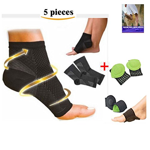 -. Feature : IMPROVEMENT FEATURES: Now available as a low-price medical treatment pack, this 5 pack of products will help you reduce pain and help treat your plantar fasciitis. The Plantar Fasciitis compression ankle socks, foot sleeve, and booklet will assist you in treating your plantar fasciitis condition and have your feet feeling better = REDUCED PAIN / BENEFITS to BUY NOW: Incorporates a graduated compression methodology with breathable material. Each piece has been specifically designed to provide support and lesson discomfort. / GIVE YOUR FEET THE SUPPORT THEY NEED! They have been supporting you all your life; make their job easier. "Help me help you" is what they're saying. This is the best plantar fasciitis pain reliever 5 piece set. / BONUS: Get everything you need and wait there's more! An e-book of doctor recommended physical therapy exercises you can do at home to improve the elasticity and strength of your foot muscles. Whether you are at home relaxing, sleeping, out exercising, or off to work, this Plantar Fasciitis kit has all the technology and information you need to lessen pain and put you on the path to healing and healthy feet. / QUALITY: Cushioned material forms to the foot and provides quality support and comfort for your plantar fascia tendons and foot muscles. The ankle sleeves offer soft but firm grip on fallen arches, flat feet, or malformed feet.