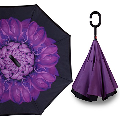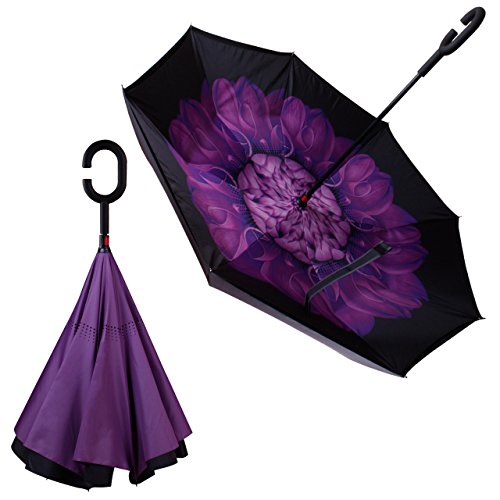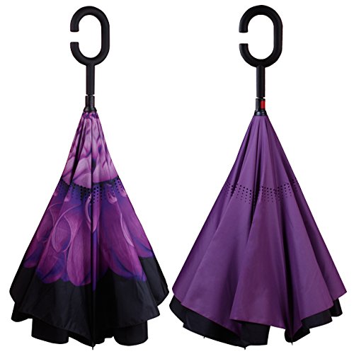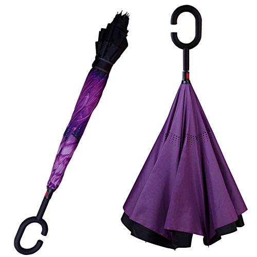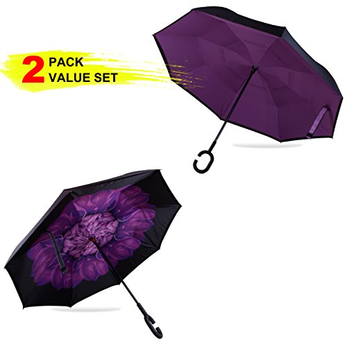 -. Feature : DURABLE MATERIALS - Upgrade Version. Higher quality thicker fabric used. Made of water repellent pongee fabric, breathable double layer canopy and smooth top, using high-quality electroplated steel shaft and premium resin-reinforced fiberglass ribs. / DOUBLE LAYER - Upside down reverse design to prevent water from dripping, it will also keep the wet part of the umbrella inside once you close it. This keeps floors and cars dry. / GREAT VALUE - Two C-Shaped Handle Umbrellas included: Purple Flower and Purple / SELF STANDING - It can be stood up on its own when you close it, which takes up less space. / IDEAL GIFTS - 2 Pack value set. Gift box included. This will be a great and creative gift for your family, friends, and lovers on birthday, Christmas, Anniversary and etc. Free umbrella carrying bag.
