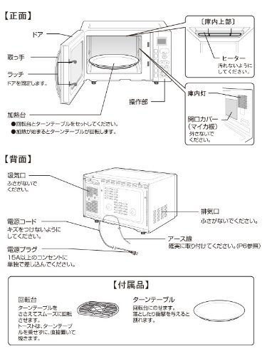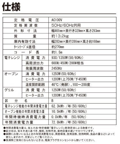 ● Power supply: AC 100V (50 / 60Hz) ● Microwave oven: power consumption 930/1350 W (50/60 Hz), high frequency output 600/450/200 W equivalent, oscillation frequency 2450 Hz ● Inside size: width 28.2 × depth 28.6 × height 16.8