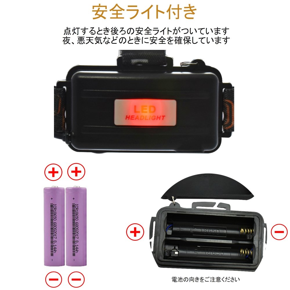 The red light of the safety light is attached to the battery case at the back of the head light, attention from the back is made, and the safety of bad weather work is secured at night