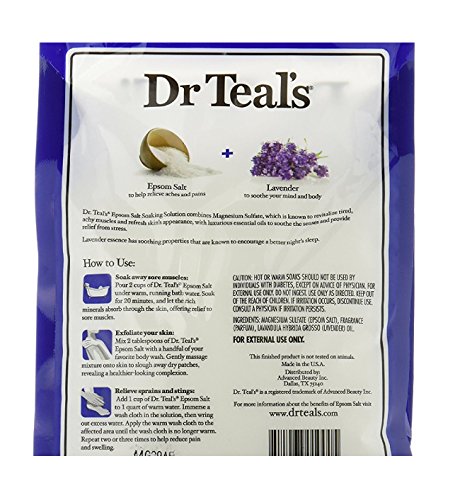 -. Binding : Misc. -. Brand : Dr Teal's -. EAN : 0811068014430 -. Feature : Easy, achievable way to soothe sore muscles after workouts, help speed recovery, and get you back in the game of life. / Ability to help reduce swelling and ease aches and pains. It's ability to soothe skin and relax muscles. / Use as part of your regular wellness regimen, Epsom Salt can help keep you feeling rejuvenated and your skin hydrated and healthy. / Epsom Salt with lavender can also contribute to a good night's rest by soaking in a warm Epsom Salt bath before bed. -. IsAdultProduct : 0 -. Label : PDC -. Manufacturer : PDC -. MPN : 17362 -. PartNumber : 17362 -. ProductGroup : Beauty -. ProductTypeName : BEAUTY -. Publisher : PDC -. Studio : PDC -. Title : DR TEAL's Pure Epsom Salt Soaking Solution with Lavender - 1 lb bag -. UPC : 811068014430