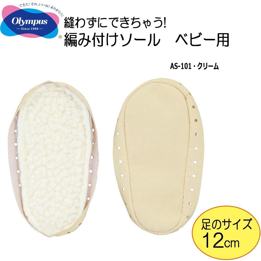 手編みのルームシューズの側面に編み付けるだけのソール(底)です。中敷きのふわふわボアがあたたかく、防寒効果も抜群です。 製造国:中国 素材・材質:ポリエステル100% 商品サイズ:足のサイズ:12cm セット内容:編み付けソール1足 ※サプライヤー直送品 ご注文後2~3営業日後の出荷となります【商品名】オリムパス 縫わずにできちゃう! 編み付けソール ベビー用 クリーム AS-101