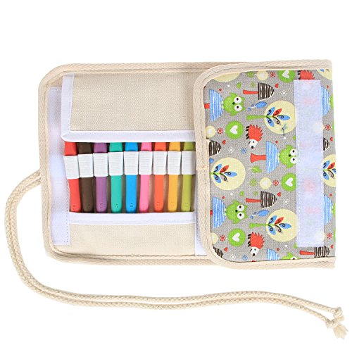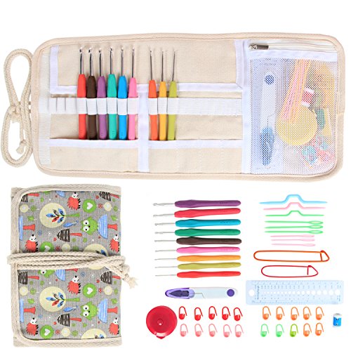Damero Ergonomic Crochet Hooks Set, Travel Canvas Roll Organizer with 9pcs 2mm to 6mm Soft Grip Crochet Hooks and Complete Knitting Accessories, All in One, Easy to Carry, Green Owls