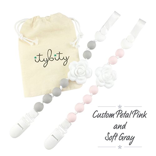Pacifier Clip Girl, BPA Free Silicone Teether, Set of 2 (Petal Pink/Soft Gray/White)