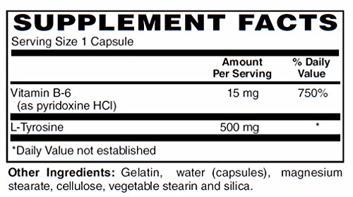 -. Feature : Contains 500 mg of L-Tyrosine per capsule, along with 15 mg of Vitamin B-6 to aid absorption / Contains NO sugar, salt, dairy, yeast, wheat, gluten, corn, soy, preservatives, artificial colors or flavors. / Sested Use: As a dietary supplement, adults take one (1) capsule, one (1) to four (4) times daily between meals, or as directed by a health care professional. Store in a cool, dry place and away from direct light.