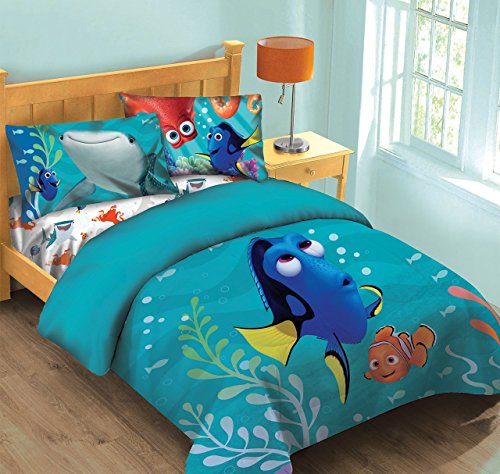 Disney Finding Dory Fish Finder juvenile twin comforter set. Comforter set includes 1 comforter, 1 fitted sheet, 1 standard pillowcase; comforter 63-inch by 86-inch, fitted sheet 39-inch by 75-inch, standard pillowcase 20-inch by 30-inch; Comforter set fabric content: 100-percent polyester; Washing instructions: machine wash in cold water, tumble dry low; ;Feature