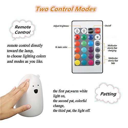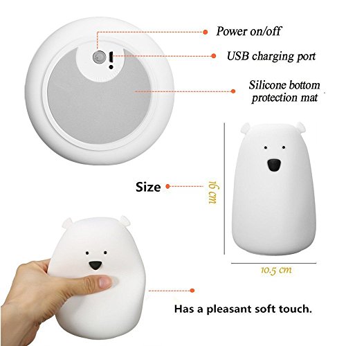 Studio : GLIME Publisher : GLIME Product Description Technical Parameters Material: Silicone ABS Shell color: White Product size: ca.11*10.5*16cm Package size: ca.12.2*12.2*15.5cm Net weight: ca.213g Gross weight: ca.330g Voltage: DC5V Rated power: 0.8W Charging Port: USB Battery: 1200mAH lithium battery NOTE: 1.Charge the night lamp fully by the packed USB cable before use. 2. If you want to turn off the lamp, please press the power button again. 3. After charging fully, please cut off the power, improve battery life. Package Includes: 1 x Night Light 1 x USB line 1 x Remote control 1 x Instruction 0