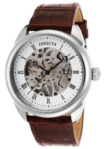 Stainless steel case with a Brown leather strap. Fixed stainless steel bezel. White skeleton dial with black hands and Roman numeral hour markers. Minute markers around the outer rim. Dial Type: Analog. Mechaniical movement. Scratch resistant flame fusion crystal. Pull / push crown. Case diameter: 42 mm. Round case shape. Band width: 22 mm. Band length: 7.75 inches. Tang clasp. Water resistant at 30 meters / 100 feet. Functions: hour, minute, second. Casual watch style. Invicta Specialty Mechanical White Skeleton Dial Light Brown Leather Mens Watch 17185.Feature