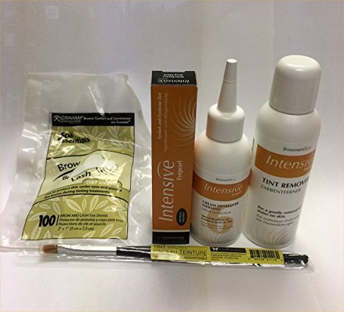 Complete kit contains Intensive Lash & Brow Tint Deep Black 20ml, 3 oz Intensive Tint Developer, 3 oz Intensive Spot Remover, Intensive Tint Brush, 100 Brow & Lash Tint Shields (protects skin under eyes & around brows)