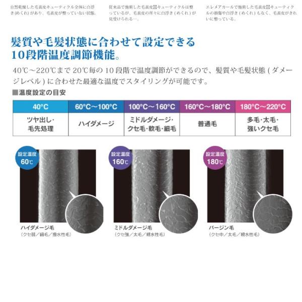 40℃~220℃まで20℃毎に調整が出来るので、髪質やダメージレベルに合わせた最適な温度でスタイリングが可能です。