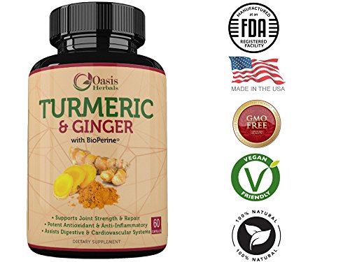 -. Feature : TURMERIC CAPSULES GINGER CAPSULES CONTAIN 95% STANDARDIZED CURCUMINOIDS which are important for purity and strength. Carefully formulated potent blend of Turmeric, Ginger & Bioperine combine to produce maximum results and rapid absorption. Bioperine, a patented black pepper extract, is vital in this supplement formulation to allow maximum nutrient absorption as described in clinical research. / ANTI-INFLAMMATORY SUPPLEMENT properties of Turmeric and Curcumin help support joint strength and repair. Assists with relief and inflammation in the lower back pain, elbow and knee stiffness and specially formulated for arthritis sufferers. / CURCUMIN WITH BIOPERINE USED BY ANCIENCE CIVILIZATIONS to harness the power of Turmeric, Curcumin and Ginger roots for stomach and digestive health. Ginger assists with nausea and vomiting, while Turmeric assists with gas and bloating. / TUMERIC WITH BLACK PEPPER CAPSULES have natural antioxidant properties with Curcuminoids and ginger. Turmeric is a potent herb used in healthy diets with fast absorbing antioxidant power that also aids in general immune system health. / TURMERIC CURCUMIN SUPPLEMENTS ARE MADE IN THE USA as are all Oasis Herbal Products. Manufactured and packaged in an FDA-Registered Facility with GMP (Good Manufacturing Process) certification, you can rely on our Turmeric & Ginger Dietary Supplement to produce consistent potency and purity.