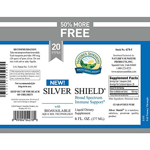 Silver Shield with Aqua Sol Technology features pure silver particles suspended in pure water for powerful immune-system support. It is manufactured using a patented process with strict quality control to verify potency and purity. The result is fine nano silver particles with 99% bioavailability. Silver particles are processed by the kidneys and may not affect populations of beneficial bacteria in the colon. Ingredients: 20 ppm of pure silver (100 mcg per serving) Recommended Use: Take 1 teaspoon three times daily.Feature