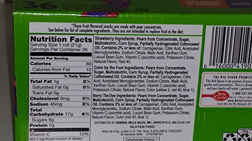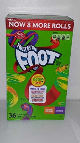 -. Binding : Misc. -. Brand : Betty Crocker -. EAN : 0016000419094 -. Feature : 36 Rolls (8 more rolls in this new pack) / Good source of Vitamin C / Low Fat / Gluten Free / 80 Calories per roll -. IsAdultProduct : 0 -. ProductGroup : Grocery -. ProductTypeName : GROCERY -. Title : Fruit By the Foot Variety Pack (Strawberry, Berry Tie Dye, Color By the Foot, 36-count Rolls -. UPC : 016000419094