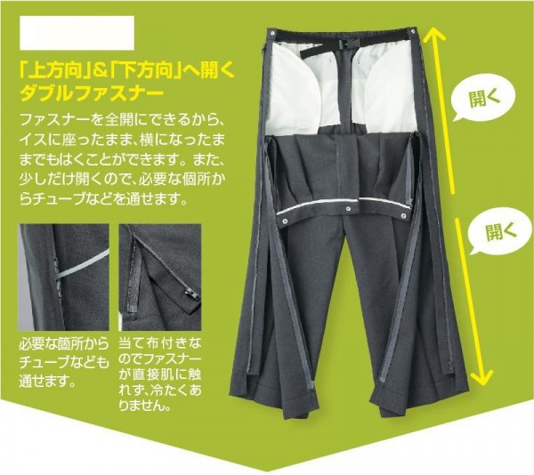 | ファスナーを全開にできるから、イスに座ったまま・横になったままでも履く事ができます。 また、少しだけ開く事ができるので、必要な箇所からチューブなどを通せます。柔らかな素材感にストレッチも効いた動きやすいパンツです。 |