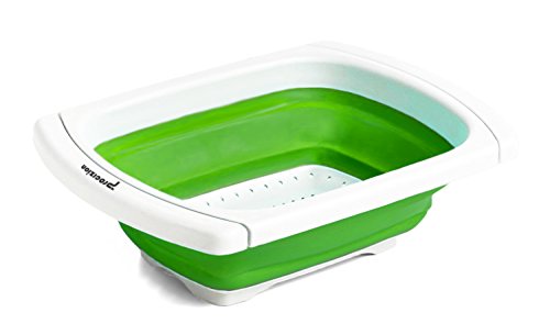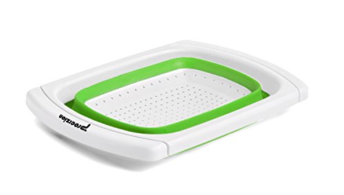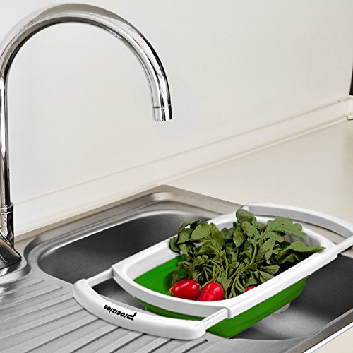 - Collapsible over-the-sink colander drains liquids quickly and easily. Perfect for rinsing or washing fruits and vegetables or draining pasta, berries, leafy greens.