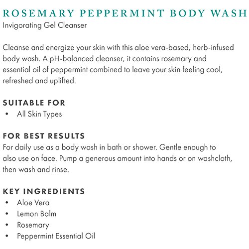 INVIGORATING, REFRESHING, CLEANSING - Cleanse and energize your skin with this aloe vera-based, herb-infused body wash. The pH-balanced cleanser contains gentle oils formulated to suit all skin types. Invigorating ingredients like rosemary and essential oil of peppermint leave your skin feeling cool, refreshed and uplifted.*