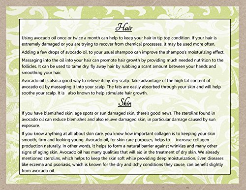 Avocados are not only a delicious fruit to eat; they can also be a valuable addition to your hair and beauty regimen. Avocados are loaded with natural fats that are excellent for your hair and scalp. They contain essential vitamins and minerals that work on rebuilding and regrowing hair. The high levels of vitamin A, D, B1, B2, and E are proven to work at the cellular level to protect and strengthen hair. These properties are why avocado oil is an excellent component to your health and beauty routine to restore shine and health to dry and mistreated hair. Avocado oil is a great source of lecithin. This yellowing fatty substance acts as a super emulsifier and lubricant. When applied topically, lecithin forms a protective covering on your hair follicles and your skin's surface, effectively preventing the loss of moisture due to wind and climate damage. Avocado oil is also high in sterolin which can be used as a softener or moisturizer in hair and skin care.Feature
