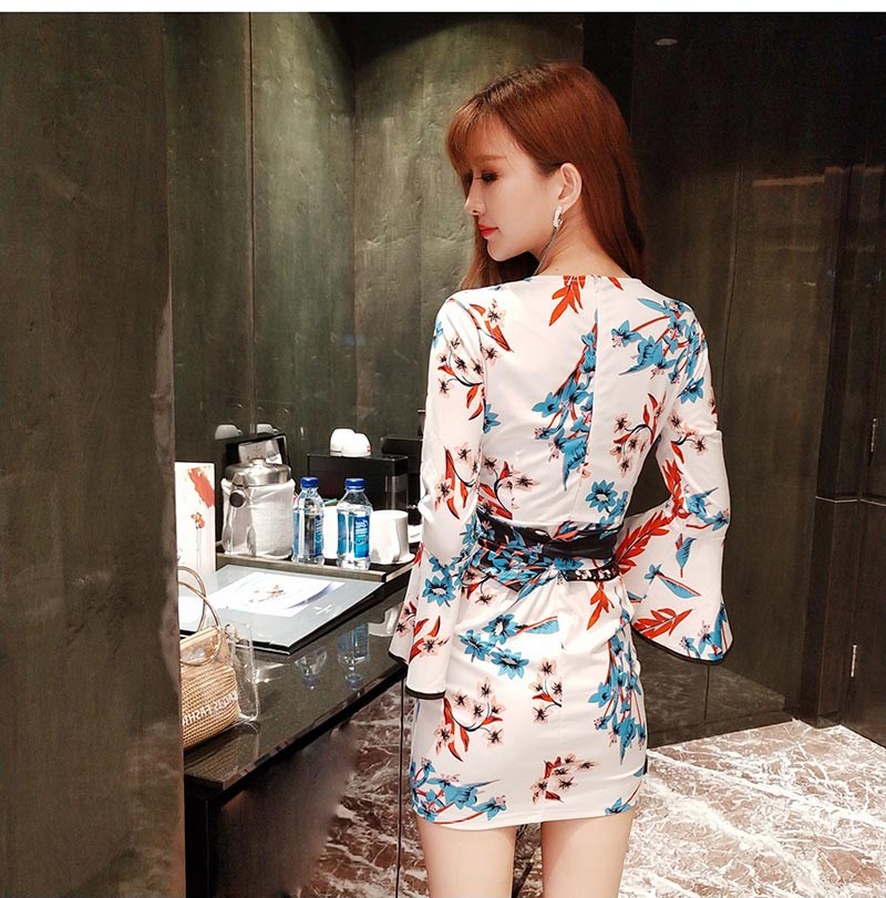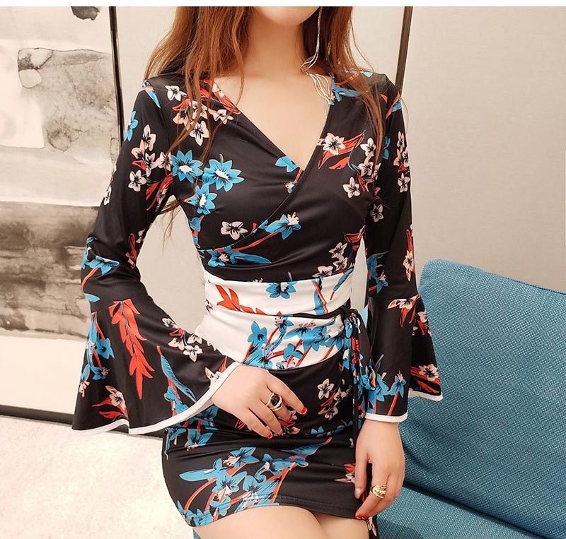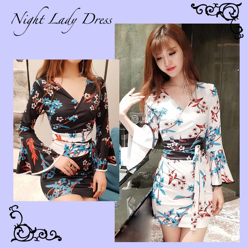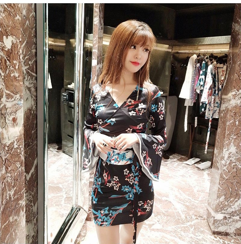 深いVネック・ベルスリーブ・サッシュべルトの着物風ワンピース♪