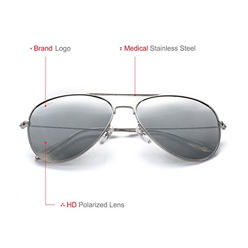 POLARIZED LENSES - These classic aviator sunglasses are polarized and provide 99% Polarization efficiency while blocking and managing UV and HEV light, delivering a superior visual experience and glare protection. Polarized sunglasses eliminate glare and haze so your eyes are more comfortable and you can see better. Polarized lenses contain a special filter that blocks this type of intense reflected light, reducing glare.