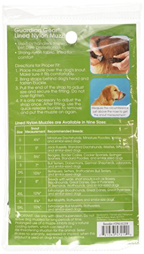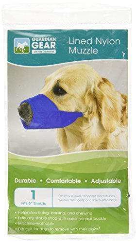 Studio : PetEdge Dealer Services Publisher : PetEdge Dealer Services Binding : Misc. Product Description Guardian Gear lined fashion muzzle is for safety when working with biting, barking and chewing dogs. Each muzzle is crafted in strong nylon fabric and lined with a foam-padded comfort strip. Features finished inner seams for extra support, fully adjustable strap and quick-release buckle. Muzzle stays securely in place, but it's a snap for people to remove and replace. 1 size muzzle fits 5-inch snout size. Available in blue color. Muzzles are the choice of top handlers, trainers and other professionals. Measures 7-4/5-inch length by 4-1/2-inch width by 1/2-inch height. 0