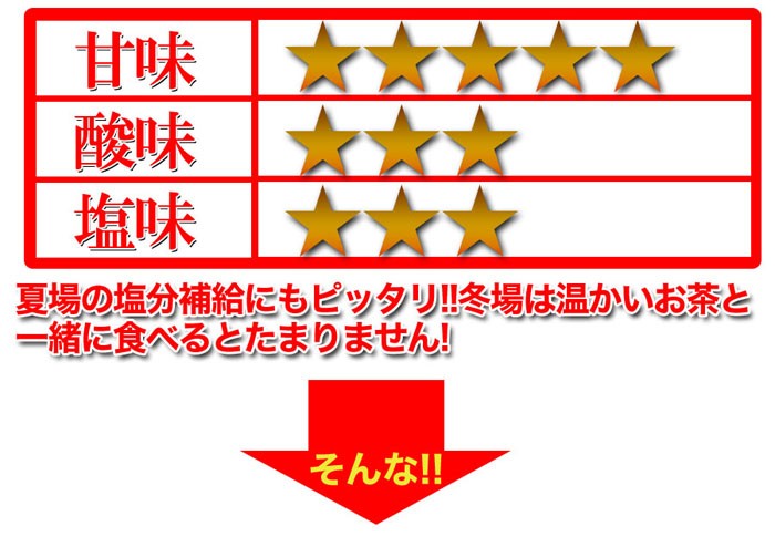 | 原材料名 | 梅、漬け原材料(還元水飴、食塩、醸造酢、発酵調味料、黒糖)、 調味料(アミノ酸等)、甘味料(ステビア、アスパルテーム、L-フェニルアラニン化合物) V.B1、ユッカ抽出物 |