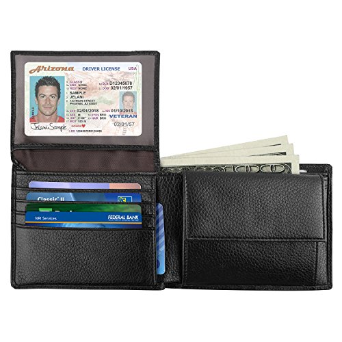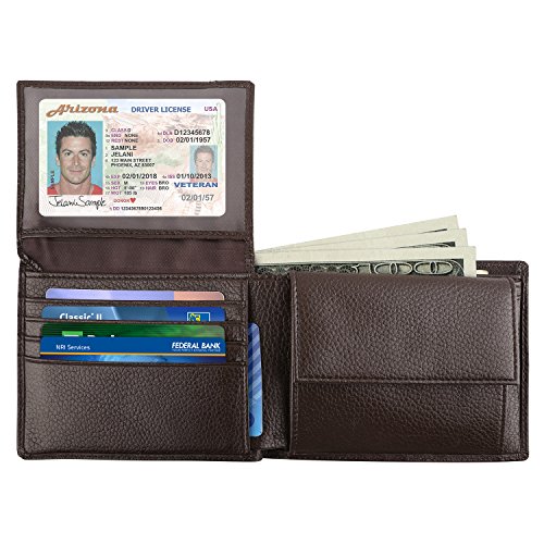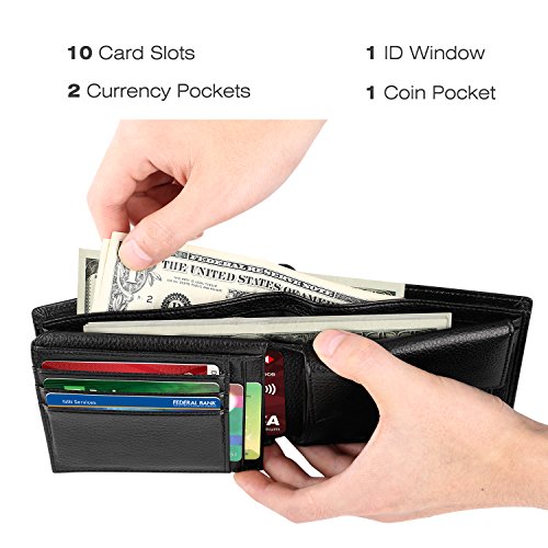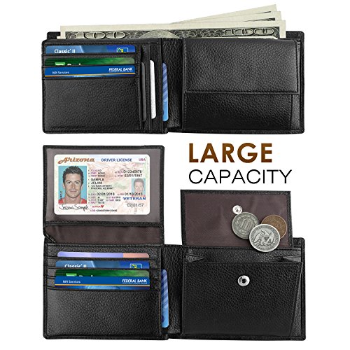 Multi-compartment Design Multi card slot design, large capacity, keep your personal items such as debit Cards, credit cards, cashes, coins, receipts etc. well organized, convenient to use. Interior: 7 Card Slots, 1 ID Windows, 2 Cash Compartments, 1 Button Pocket, 2 Concealed Compartments.