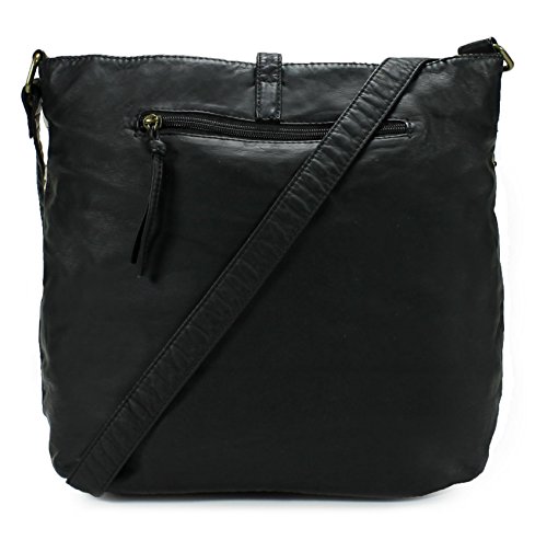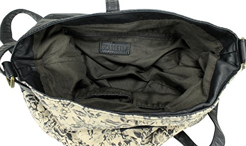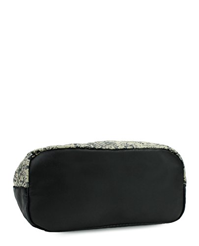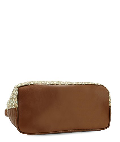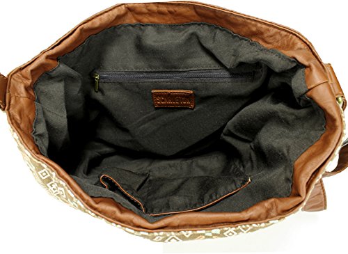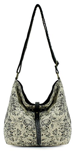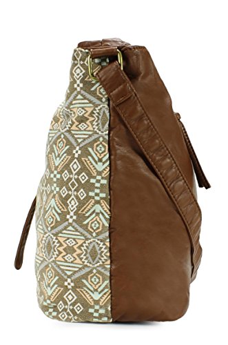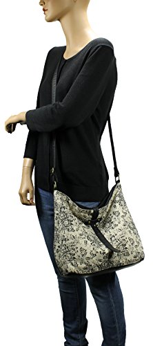 -. Feature : High quality fabric and synthetic washed vegan leather with fabric lining. / Classic bronze-toned hardware. / Interior cell phone pocket, multifunctional slip and side zipper pocket. / Adjustable shoulder strap drops 25". / Size: 14" x 11" x 5.6"