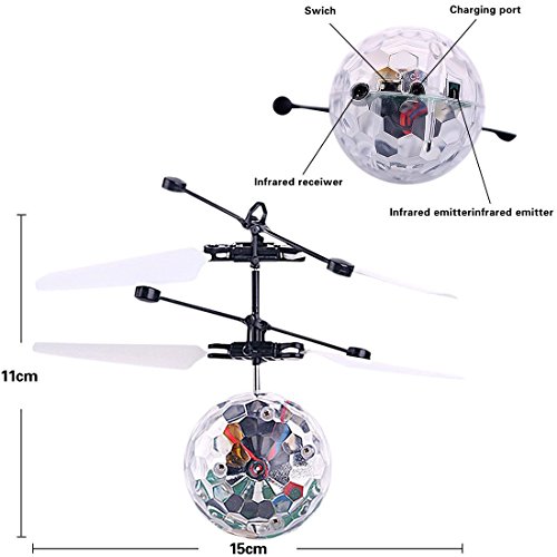 Music Flying Ball Size: 15.5 * 11cm Accessories: aircraft x1, data cable x1 Charging time: 15-20 mins,runing Time Lasted : 8-10 mins Dimensions:11.3 x 5cm (H x W). Remote Controller Dimension: 4.7 x 4.5cm (L x W) Body Material: ABS Plastic. F100% Brand New. Suitable for: Ages 8 . USB Charging Controller Battery: 1 x 3V CR2302 Lithium Battery (Included).Remote Distance: About 5-8 meters. Auto Start induction Instructions for operation: