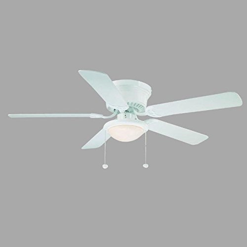 Use this low-profile Hampton Bay 52 in. Hugger Ceiling Fan for flush-mount installations when ceiling height is of concern. Featuring reversible blades, the fan's traditional, classic white finish is complemented by both the bleached-oak blade finish and the white blade finish. The opal frosted dome light fixture (bulb not included) provides illumination. With a high-performance motor for powerful, yet quiet operation and 52 in. blades, this fan is ideal for most interior rooms up to 20 ft. x 20 ft. Reversible blades with white finish on one side and bleached-white finish on the other Integrated frosted opal schoolhouse light fixture 3-speed reversible control for versatile use White finish complements many interior accents Traditional style for a timeless look Designed for interior use Flushmount installation for low ceilings Uses a medium-base bulb (not included) Multi-capacitor for quiet operation and maximum air movement For most interior rooms up to 20 ft. x 20 ft. MFG Brand Name :AIR COOL INDUSTRIAL CO LTD MFG Model # : AL383-WH UPC No. : 792145358329 Assembled Depth (in.) 52 in Assembled Height (in.) 11.79 in Airflow (CFM) 4670 Distance from Ceiling to Bottom of Fan (In.) 12.99 Fan Blade Length (In.) 21.2 Fan Blade Width (In.) 5.56 Motor Speed (RPM) 160 Number of Speeds 3 Side 1 Fan Blade Color Family White Side 2 Fan Blade Color Family Bleached OakFeature