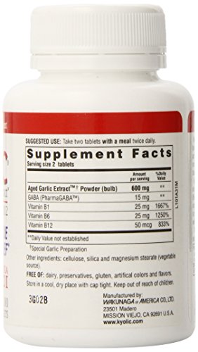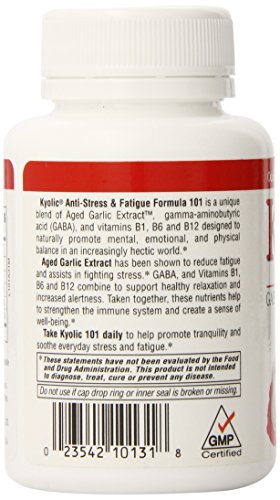 ReleaseDate : 2015-03-19 Studio : Wakunaga of America., Ltd. Publisher : Wakunaga of America., Ltd. Binding : Health and Beauty Product Description Kyolic aged garlic extract stress and fatigue relief formula 101. Description: odorless organic garlic supplement. Formula 101. Helps increase energy. Kyolic aged garlic extract begins with 100% organically grown garlic bulbs. They are then age to perfection in a unique extraction process to eliminate odor and create beneficial compounds found only in kyolic. This select combination of aged garlic extract, brewer's yeast and kelp helps speed recovery from fatigue. Take the best - kyolic aged garlic extract, the most scientifically researched, highest quality and best-selling odorless sociable garlic. Free of sodium, preservative, gluten, artificial colors, flavors, and sugar. Disclaimer: these statements have not been evaluated by the FDA. These products are not intended to diagnose, treat, cure, or prevent any disease. 0